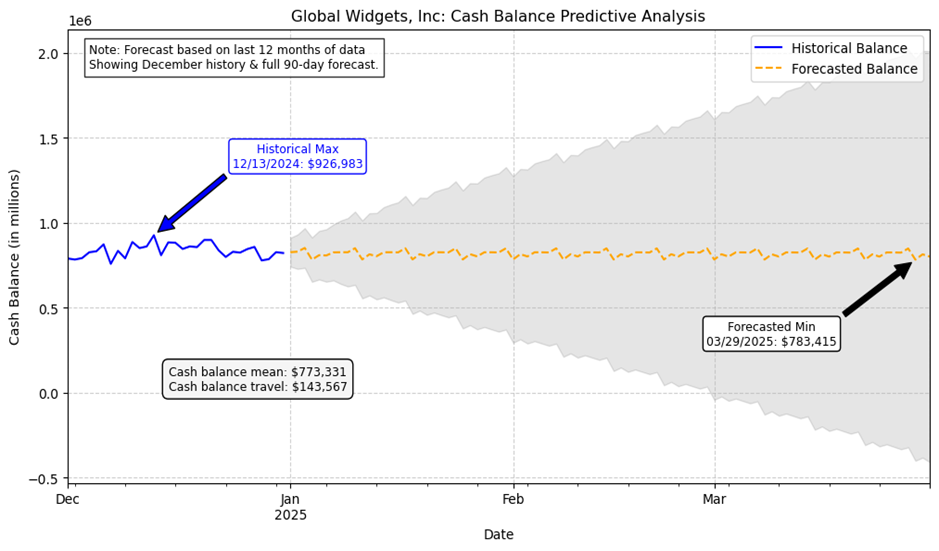 This chart is generated entirely by a Python script within Excel, not manual formatting. It visualizes a 90-day SARIMA forecast based on the client’s last 12 months of daily cash balance data. Key annotations—the Historical Max from December and the Forecasted Min in March—are automatically calculated and placed to highlight the projected “cash balance travel,” or variance.